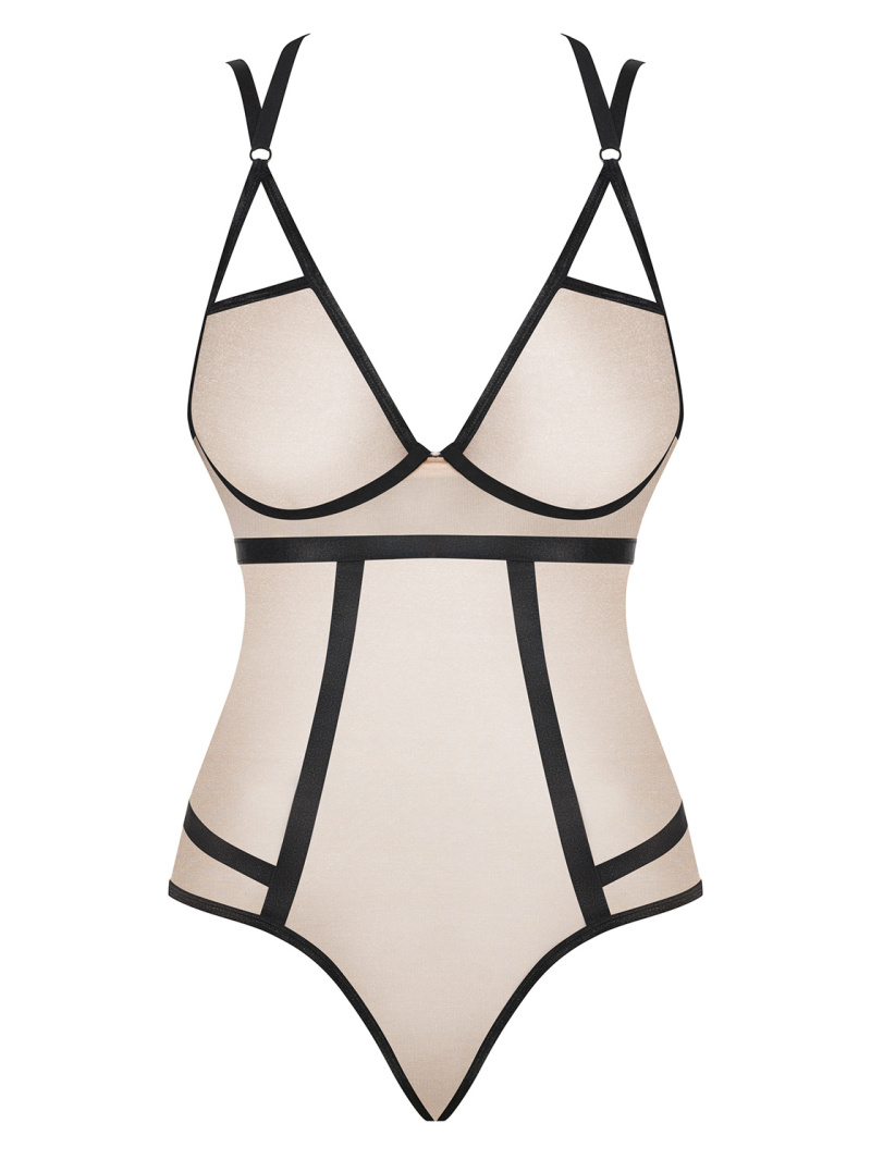 Surprinde-l și lasă-l fără cuvinte purtând acest body sofisticat, în nuanță crem cu bretele negre contrastante și inserții elegante. Confecționat din tul semitransparent, acest body combină rafinamentul cu o notă de senzualitate provocatoare. Partea superioară este lipsită de sârme de susținere sau întărituri, pentru un plus de confort și libertate. Bretelele negre, ajustabile, accentuează subtil liniile naturale ale corpului, asigurând o potrivire personalizată și un efect vizual deosebit.