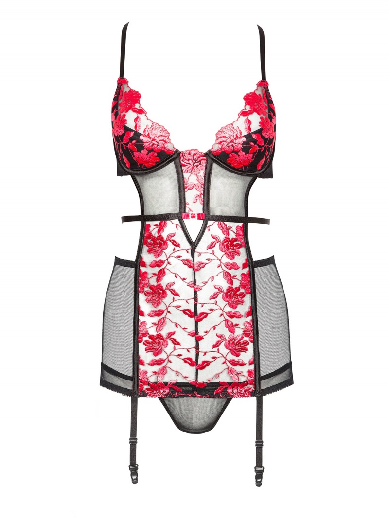 Realizat dintr-un material ușor elastic, cu un design ce combină tulul fin și dantela brodată cu accente florale roșii, acest chemise adaugă un aer sofisticat și seducător ținutei tale. Contrastul delicat al materialelor atrage privirile și pune în evidență frumusețea formelor tale.