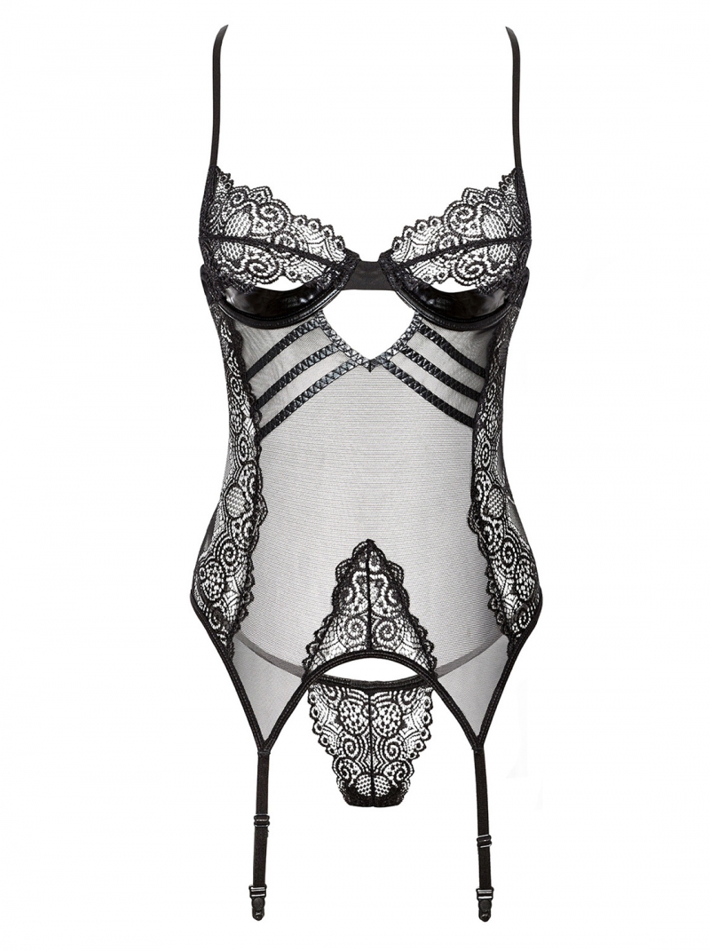 Elemente realizate din material lucios lacuit. Cupele de sutien usor rigidizate (nu pot fi indepartate) au decupaje seducatoare. Partea din spate a corsetului are un decolteu profund ce expune spatele.