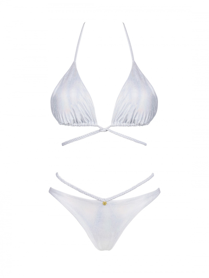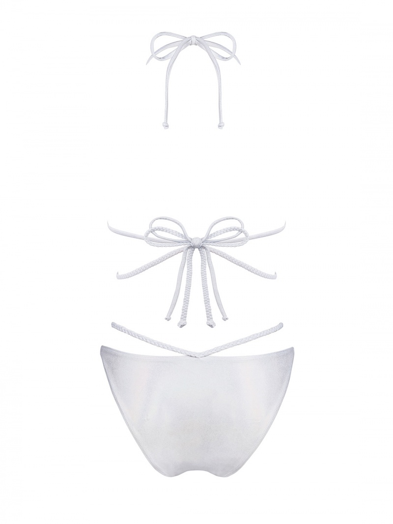 Bretelele asimetrice sub bust accentuează subtil silueta, în timp ce chiloțul decorat cu două bretele pe șolduri adaugă un farmec irezistibil întregului ansamblu.