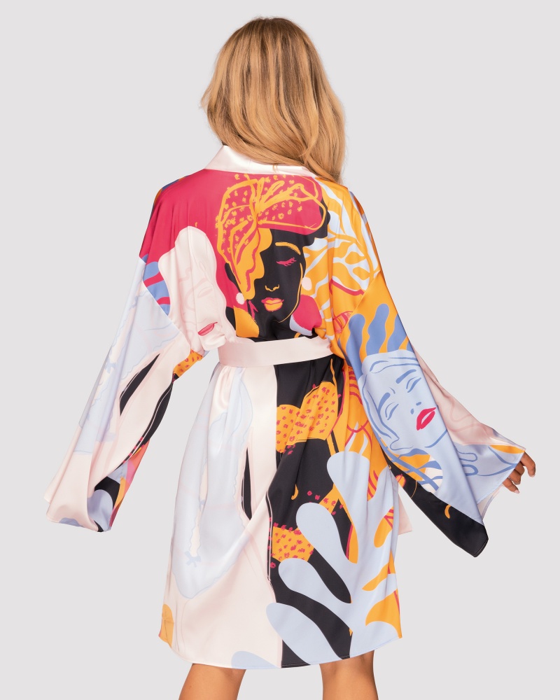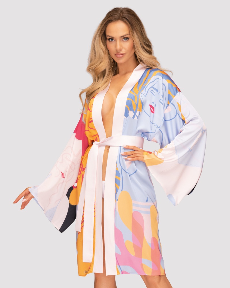 Prin culorile sale sunt infatisate trei femei in lenjerie intima, iar manecile lungi si largi ofera o eleganta aparte a produsului!